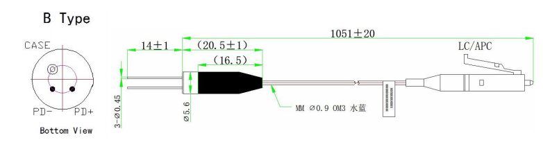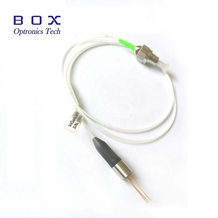 InGaAs Pigtailed Photodiodes gekoppelde multimode glasvezel, met een kerndiameter van 50 µm of 62,5 µm, selecteerbaar, en een detectiegolflengtebereik van 900-1700 nm.