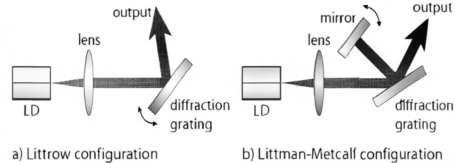 Hoofdholtelasers met korte holte, zoals DFB en DBR, hebben een beperkte fotoninteractietijd binnen de holte, waardoor diepe lijnbreedtecompressie moeilijk wordt. Om de lijnbreedte verder te comprimeren en ruis te onderdrukken, worden dergelijke hoofdholteconfiguraties met korte holte vaak gecombineerd met structuren met externe holtes voor prestatie-optimalisatie. Veel voorkomende structuren met externe holtes omvatten ruimtelijke externe holtes, externe holtes van vezels en externe holtes van golfgeleiders. Vóór de ontwikkeling van glasvezelapparaten en golfgeleiderstructuren bestonden externe holtes voornamelijk uit ruimtelijke optica gecombineerd met discrete optische componenten. Hiervan nemen op roosters gebaseerde ruimtelijke feedbackstructuren met externe holte voornamelijk de ontwerpen van Littrow en Littman over, meestal bestaande uit een laserversterkingsholte, koppellenzen en een diffractierooster. Het rooster, als feedbackelement, maakt afstemming van de golflengte, modusselectie en lijnbreedtecompressie mogelijk.