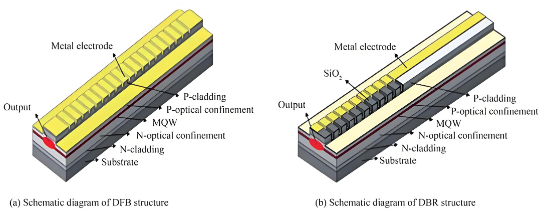 De technische uitdaging van DFB-lasers ligt in de fabricage van roosterstructuren. Er zijn twee primaire methoden voor de fabricage van roosters in DBR-halfgeleiderlasers: secundaire epitaxie en oppervlakte-etsen. Regrown grating feedback (RGF)-DFB halfgeleiderlasers maken gebruik van secundaire epitaxie en fotolithografie om een reeks roosters met lage brekingsindex in het actieve gebied te laten groeien. Deze methode behoudt de actieve laagstructuur met weinig verlies, waardoor de fabricage van high-Q-resonatoren wordt vergemakkelijkt. Oppervlakterooster (SG)-DFB-halfgeleiderlasers omvatten het direct etsen van een roosterlaag op het oppervlak van het actieve gebied. Deze benadering is complexer en vereist een nauwkeurige aanpassing afhankelijk van het materiaal in het actieve gebied en de doteringionen, en vertoont een hoger verlies, maar biedt toch een sterkere optische opsluiting en een hoger vermogen tot onderdrukking van de modus.